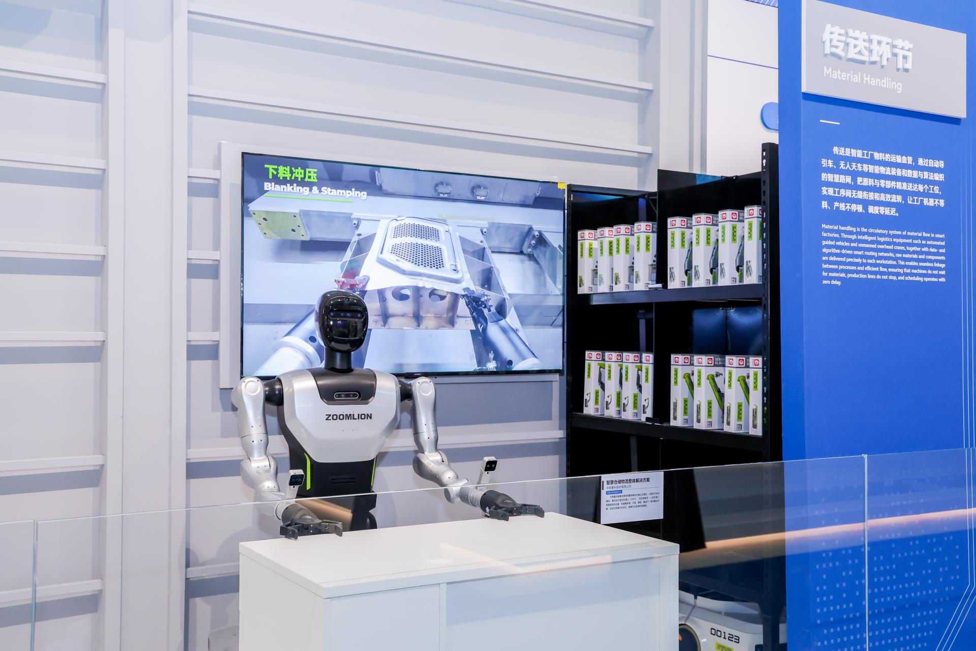 ▲中聯(lián)重科人形機器人與智慧倉儲物流整體解決方案展示