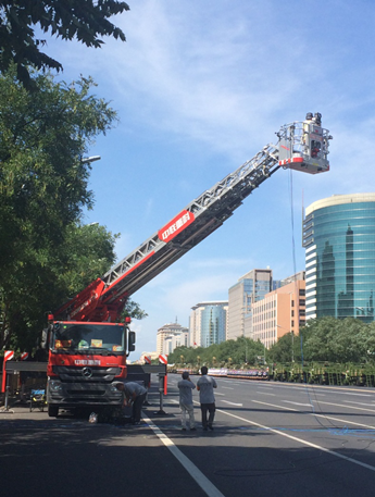 位于長安街南側(cè),人民大會堂附近的是亞洲目前**高的云梯消防車,型號為YT60的中聯(lián)重科60米云梯消防車。它主要承擔了兩項重要任務,前期主要配合QY80起重機進行“天鷹座”的牽線工作;而在慶典當天,央視工作人員在YT60撐起的工作斗里進行現(xiàn)場拍攝,電視中許多天安門城樓上領(lǐng)導、嘉賓以及受閱部隊通過天安門前的正面鏡頭就是由它捕捉的。