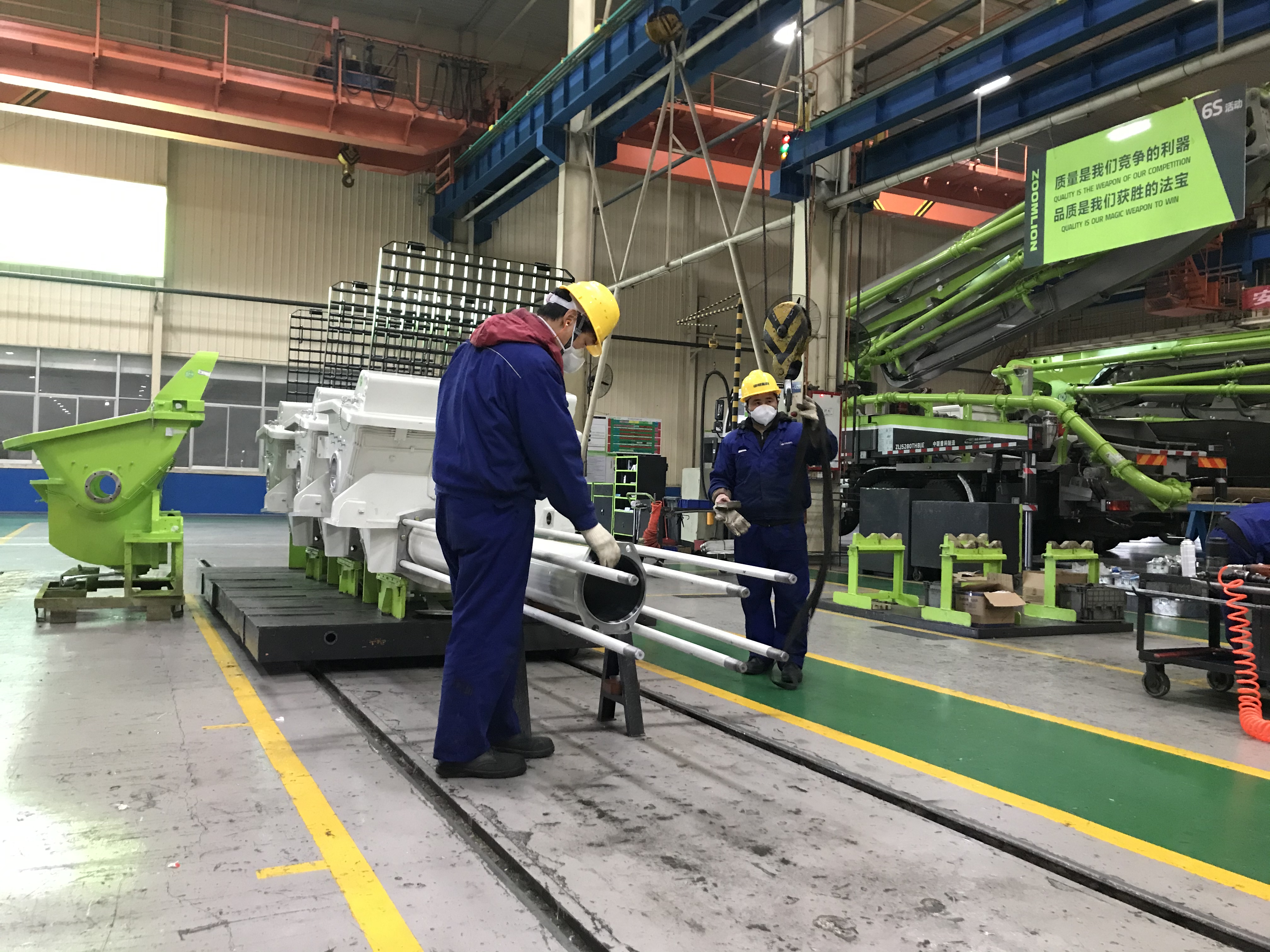 “我們裝配以后,再經(jīng)過幾道工序以及調(diào)試,這臺拖泵就完成了”,在中聯(lián)重科混凝土泵送機(jī)械分公司的總裝車間里,一名戴著口罩的工人介紹道。