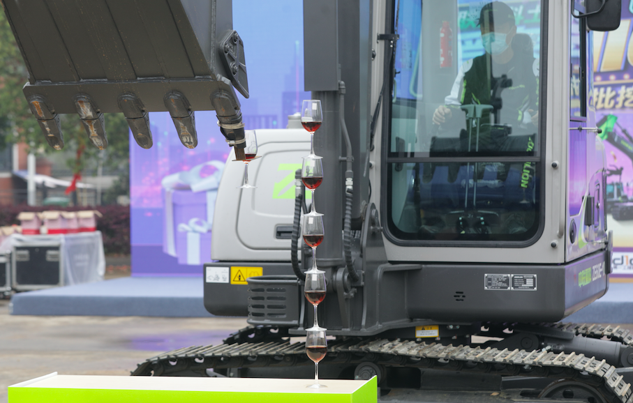 △中聯(lián)重科產(chǎn)品經(jīng)理結(jié)合ZE60E-10挖掘機疊高腳杯表演講解產(chǎn)品性能