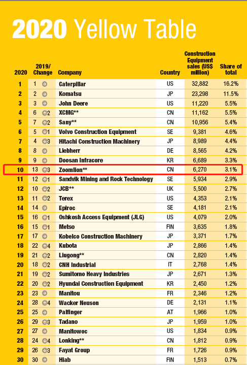 ? ?近日,英國KHL集團發(fā)布了一年一度的全球工程機械制造商50強排行榜《2020 Yellow Table》。榜單顯示,中聯(lián)重科以60多億美元的銷售總額位列榜單前十強,充分凸顯了中聯(lián)重科近年來取得的高質(zhì)量、高效率、可持續(xù)發(fā)展成果。
