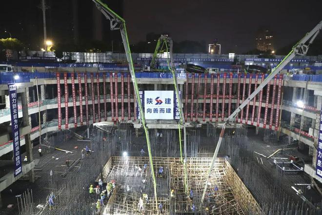 該項(xiàng)目基坑深度近20米,筏板**厚處為7.55米,整個(gè)基礎(chǔ)底板澆筑工程采用多點(diǎn)同時(shí)澆筑,從中心向四周,由深到淺,斜面分層施工,整體一次完成澆筑。為應(yīng)對(duì)跨晝夜深基坑連續(xù)作業(yè),項(xiàng)目方經(jīng)過多方對(duì)比,**終選擇中聯(lián)重科設(shè)備承擔(dān)重任。