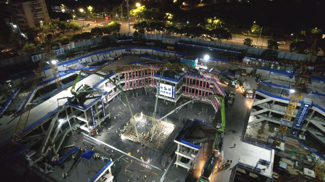 7月31日20時(shí),這場澆筑“車輪戰(zhàn)”正式拉開帷幕。中聯(lián)重科56米、63米及數(shù)臺(tái)“凌云Ⅱ”62米泵車,以及三臺(tái)22MPa車載泵進(jìn)駐施工一線,面對(duì)高溫條件下大體積混凝土澆筑、超70小時(shí)深基坑不間斷施工、地下空間狹小等諸多難題,3臺(tái)泵車和3臺(tái)車載泵同時(shí)作業(yè),憑借出色的穩(wěn)定性和可靠性大顯身手,澆筑沖刺階段峰值達(dá)260m3/小時(shí)。8月3日20時(shí),“小綠奇跡軍團(tuán)”不負(fù)期待,順利完成**后一方混凝土澆筑。