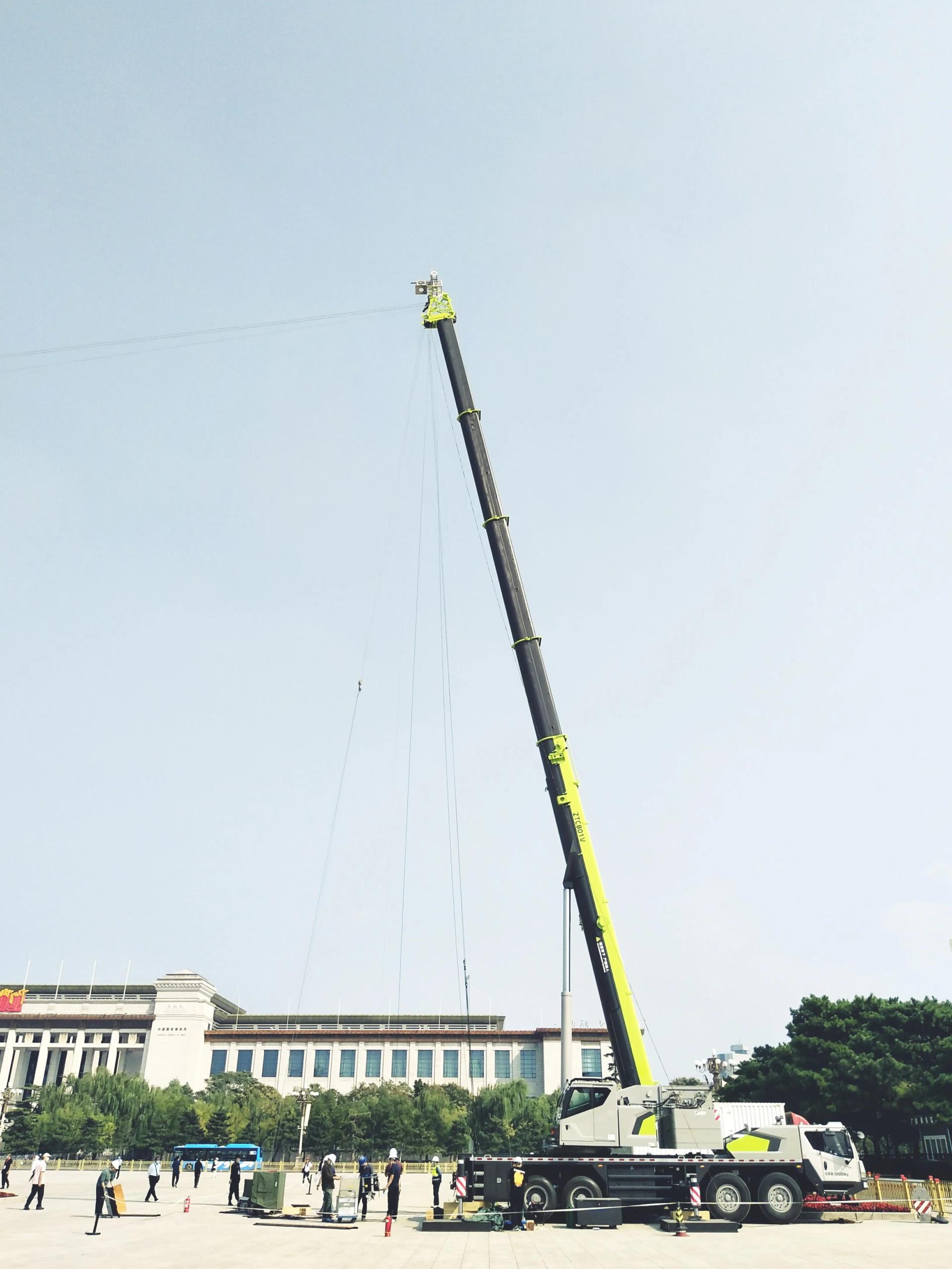 在儀式現(xiàn)場(chǎng),天安門(mén)廣場(chǎng)南北兩側(cè)位置,兩臺(tái)“極光綠”汽車(chē)起重機(jī)以卓越品質(zhì)和穩(wěn)定性能支撐搭建起一條高40米、長(zhǎng)300米的空中索道,其搭載的“天鷹座索道攝像系統(tǒng)”從高空完美呈現(xiàn)了整場(chǎng)活動(dòng)的全景視角,讓廣大觀眾更真切地感受儀式的現(xiàn)場(chǎng)氛圍。