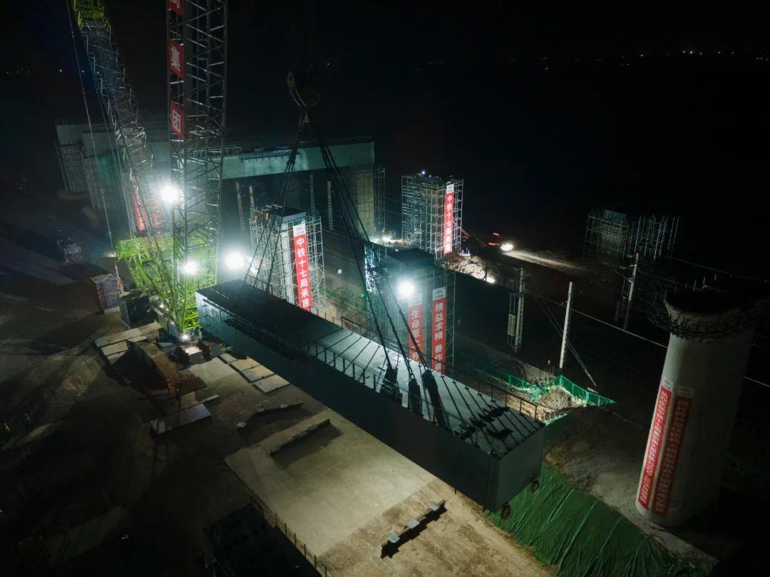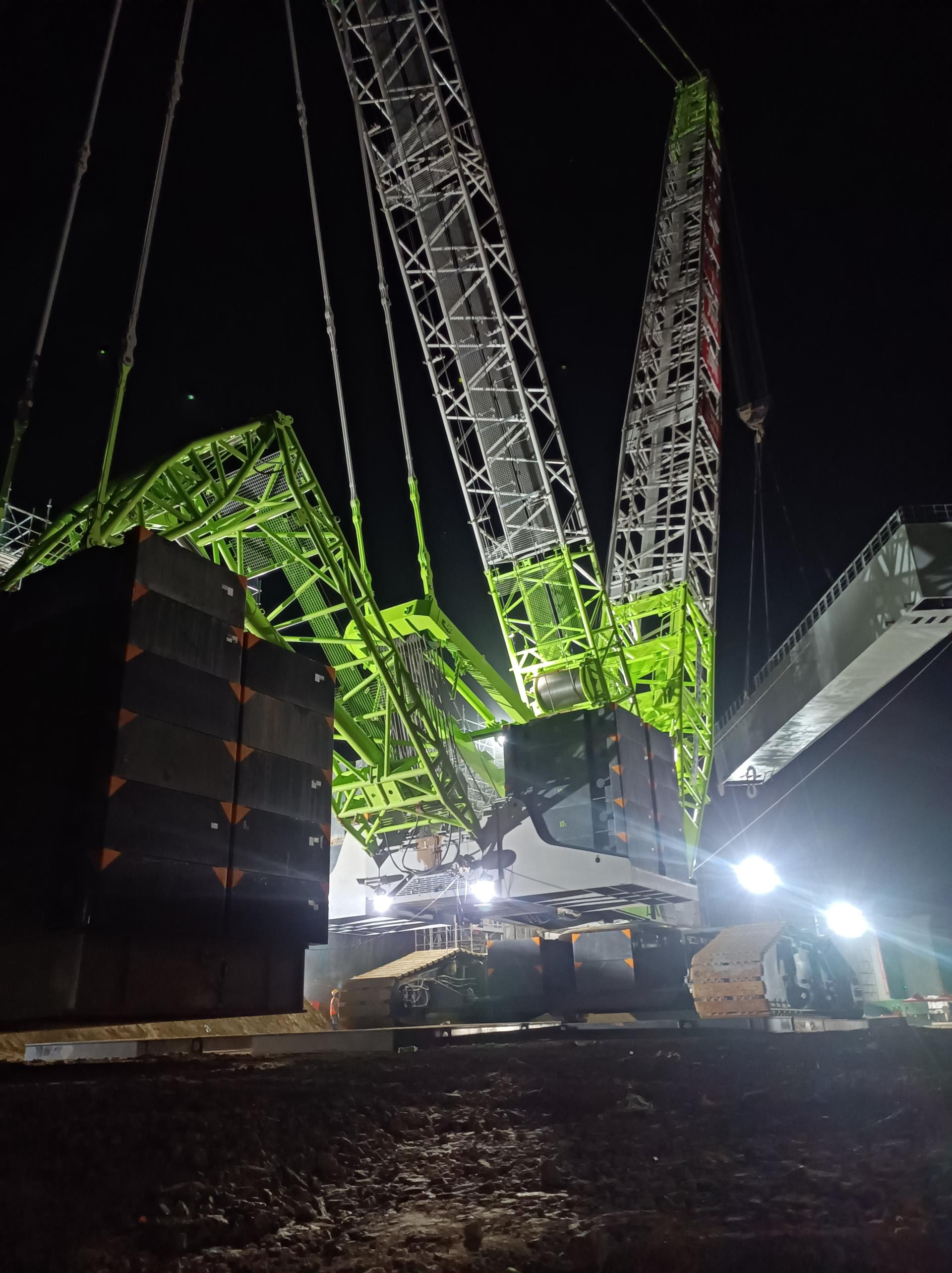 在中聯(lián)重科履帶吊吊裝的鋼橫梁中,有一榀長33.84米,寬4.58米,高3.5米,重達276.4噸,需要將其吊至離地面18米,相當于6層樓的高度,還要平穩(wěn)落在框架墩上,偏差要控制在毫米級,即使風力的影響都要嚴格計算,做到“繡花”一樣精細。4月20日凌晨,中聯(lián)重科千噸級履帶吊穩(wěn)穩(wěn)起吊橫梁,旋轉、擺正、下落、校正一氣呵成,施工用時不到30分鐘,贏得項目部高度贊譽。