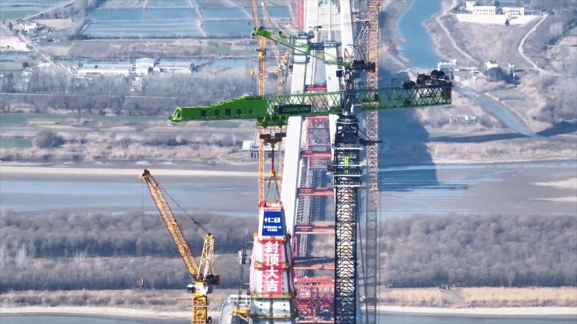 ▲中聯(lián)重科全球**大塔機(jī)完成馬鞍山長江公鐵大橋南主塔封頂?shù)跹b