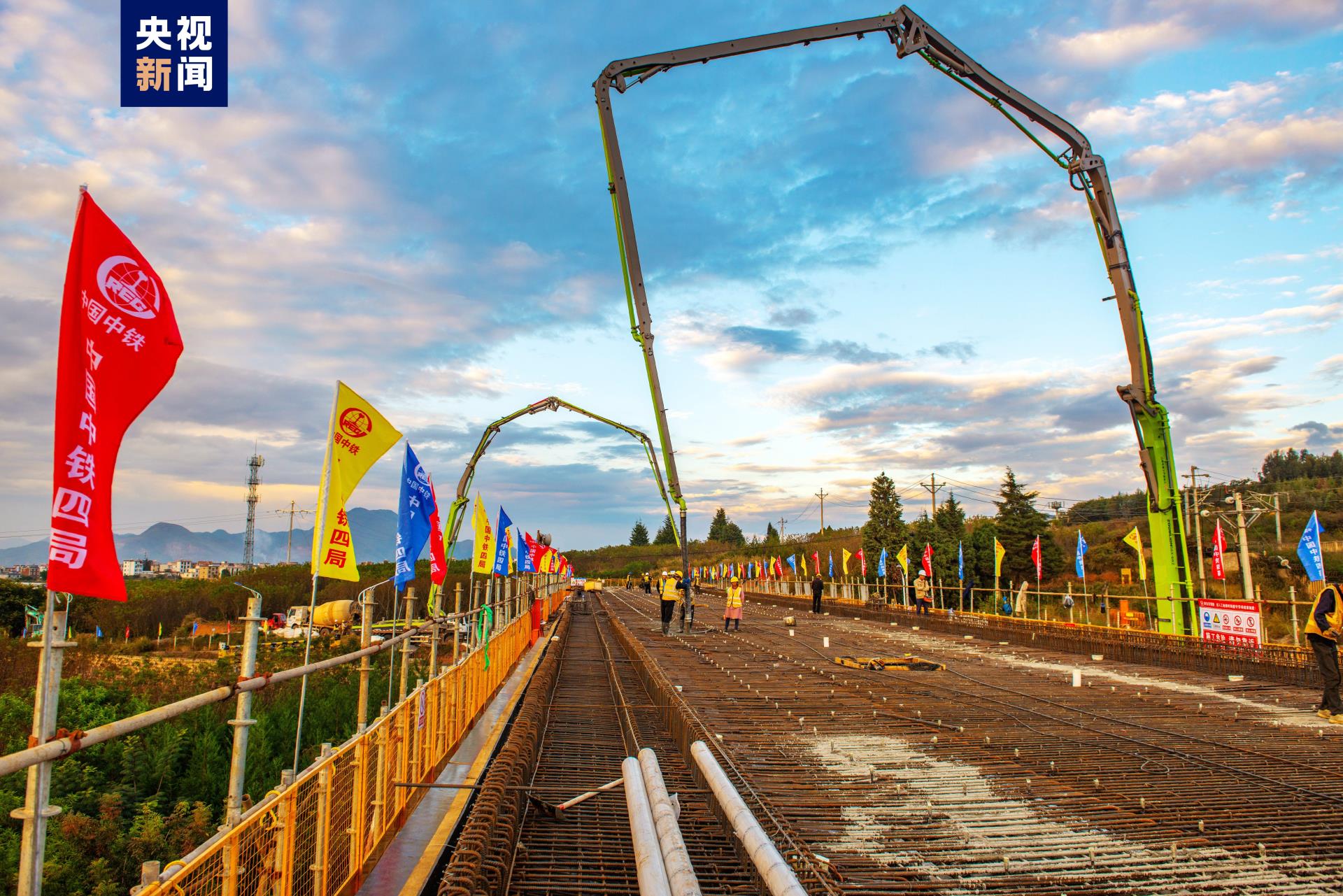 10月25日,央視《新聞聯(lián)播》報道,渝昆高鐵云南段首座大橋連續(xù)梁完成混凝土澆筑施工,標志著渝昆高鐵云南段橋梁建設由下部工程向上部工程邁進。報道顯示,助力渝昆高鐵建設取得新突破的設備,正是數(shù)臺身著極光綠的中聯(lián)重科混凝土泵車。
